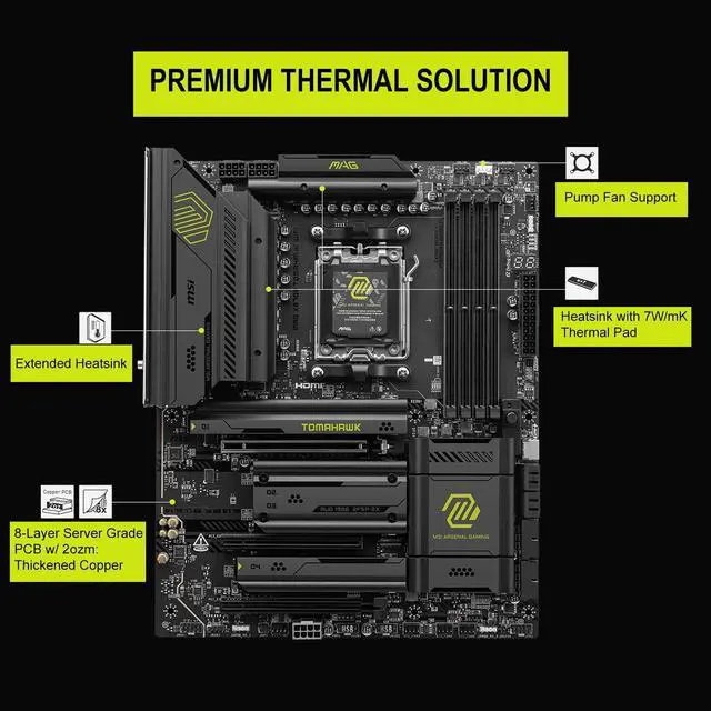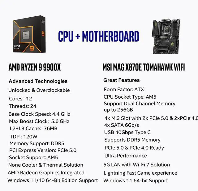 OS Support: Windows 11/ 10-64-Bit Edition. Cooler & Thermal Solution (PIB) not included. AMD Radeon Graphics Integrated ^^ MSI MAG X870E Tomahawk WiFi Motherboard, ATX Form Factor, Supports Dual-Channel DDR5 up to 256GB, PCIe 5.0 Supports, 2x PCIe 5.0 x4 M. 2 Slot, 2x PCIe 4.0 x4 M. 2 Slot, 4x SATA 6GB/s, 2x USB 40Gbps Type C, Wi-Fi 7, Bluetooth 5.4, Windows 11 64-bit Support, Supports AMD Ryzen 9000/ 8000/ 7000 Series Desktop Processors ^^ Supports DDR5 Memory, Dual Channel DDR5 8400+ MT/s (OC); /