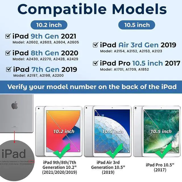 Compatible Models: for iPad 10.2 inch (2021) (iPad 9th Gen), (Model: A2603 A2604 A2605); for iPad 10.2 inch (2020) (iPad 8th Gen), (Model: A2270 A2428 A2429 / A2430); for iPad 10.2 inch (2019) (iPad 7th Gen), (Model: A2197 A2198 A2200); for iPad Air 3 ( 10.5 inch) (2019) ( iPad Air 3rd Gen), Model: A2152 A2123 A2153 A2154); for iPad