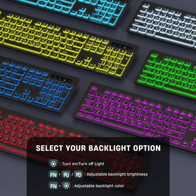 Mac OS (Note: Multimedia keys may not fully compatible with Mac, OS System). Wireless keyboard and mouse suitable for desktops, Chrome-book, PC, Laptop, Computer, Smart TVs and more. ^^ Rechargeable and Long-Lasting The rechargeable keyboard and mouse are equipped with a type-c charging cable, standby time is up to 2000 hours. Has a friendly smart energy-saving feature that automatically turns off the backlight after 120 seconds of non-use, the wireless combo with a separate power switch and backlit switch to save power. ^^ Wireless Connection and Silent Typing Plug & play, wireless keyboard mouse combo shares the same USB receiver, which is stored in the mouse. 2.4GH z wireless technology provide a stable and reliable connection up to 33ft without any latency. Light and responsive tactile keystrokes make typing soft, quiet and comfortable.