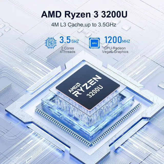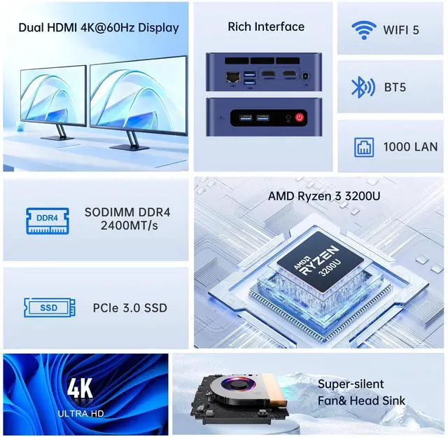 2 PCIE 3.0 x4 (2280) slot (Incompatible with SATA3 SSDs), or add a 2.5 inch 7mm HDD(max 2TB, excluded) to expand the storage. Large capacity brings quicker load times across your entire catalogue of apps and programs ^^ USB 3.2 + WiFi 5 + BT 5.0B eelink AMD Ryzen 3 3200U Mini Desktop Computer is equipped with rich interfaces: USB 3.2 x4, HDMI x2, 1000M LANx1. The transmission rate of USB 3.2 is up to 10Gbps, 21 times faster than USB 2.0. WiFi 5 ( 802.11 ac) Bluetooth 5.0 lower latency, more stable and efficient to connect to multiple wireless devices such as projector, printer, monitor, speakers and etc ^^ Improve Work EfficiencySER3 Dual HDMI prots allow you to expand your viewing area to enjoy better experience and multi-task easily, i. e. web browsing, design, 4K videos playback, online class, perfectly valid as a multimedia center to use KODI, IPTV or use as a digital signage and brings true-to-life 4K@60Hz visual feat to the audiance ^^ Why Beelink Mini PCBeelink SER3 VESA mount can hide the micro pc behind a monitor or HDTV like an all-in-one pc, free you from messy desktop, Cooling system Large fan and dual heat conduction tube, make heat dissipation more efficient, 3200U Mini desktop pc also supports Wake On LAN, RTC Wake, Auto Power On, a great to use as a server for media (Plex or FTP)