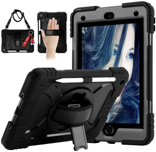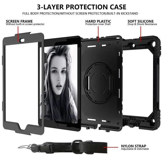 Ideal for different careers or outdoor activities. Attach the strap to any two corner holes of this iPad 10.2 case. Carry your iPad conveniently wherever you are at home, at work, or outdoor. You can also hang it behind the headrest of the car seat for shared viewing. ^^ 3 Layer Durable Protection Constructed with a sturdy PC material and a soft, durable silicone shell, this case for iPad 9th/8th/7th generation features four corner airbags and a 5mm higher border bump around the screen. The outer silicone can absorb the impact from accident drop or shock, offering comprehensive protection for iPad.