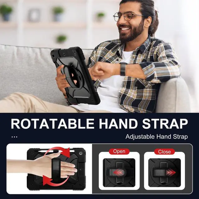 ^^ 360Swiveling Stand & Hand StrapThis iPad 9th 8th 7th Generation Case built-in 360 degree turntable kickstand and adjustable handle hand strap provides a more flexible and convenient way to use your tablet during work, study or journey, ideal for students, teachers, engineers, cashiers and waiters, etc. ^^ Perfect GiftsEasy-to-grab bump design is more friendly to kids and students. Children can enjoy their iPad anytime, anywhere. Available in a variety of bright and fun colors, catering to children's preferences for personalization and style. Perfect gift for kids, mother, wife, girlfriend and friends for Anniversary Day, Mother's Day, Birthday, Christmas Day, Valentines Day, etc.