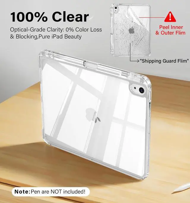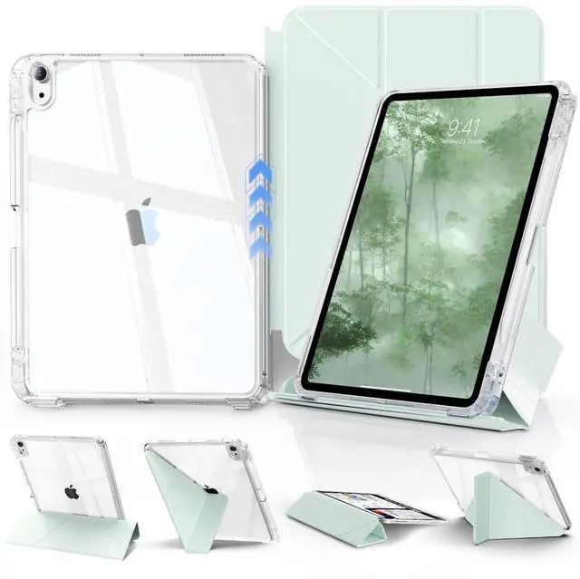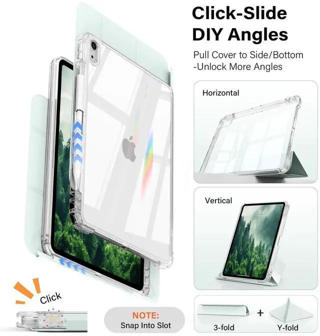 Generation 10.9 -inch (2022): Models A2696/A2757/A2777. Confirm back "A" number before choosing this case to protect your investment. ^^ Fully Clear Hard backShow off your iPad's original sleek design with a fully transparent back that shines in sunlight. This iPad a16 case is perfect for personalizing with your favorite stickers or photos, making it uniquely yours. ^^ 8+ Viewing AngleA revolution in flexibility. This detachable sliding cover for the iPad 11th gen case works on 2 sides with 2 folding modes, creating 8+ angles. Perfect for watching, typing, or video calls. Say goodbye to limited views. ^^ Anti-tip Y-fold StandThe unique Y-fold design creates a wider, more stable triangle than old tri-folds. It won't tip over even when you type/press hard, keeping your i Pad 10th gen case steady on your lap, desk, or soft bed surface, etc. ^^ Shield Eco-fabricMade with advanced eco-material, the iPad 11-inch case resists stains, scratches, and fingerprints. Its textured surface provides a secure, anti-slip grip. Spills wipe away easily, keeping your case clean and iPad safe. ^^ 360 stable protectionThis iPad 11th gen case offers all-around security.