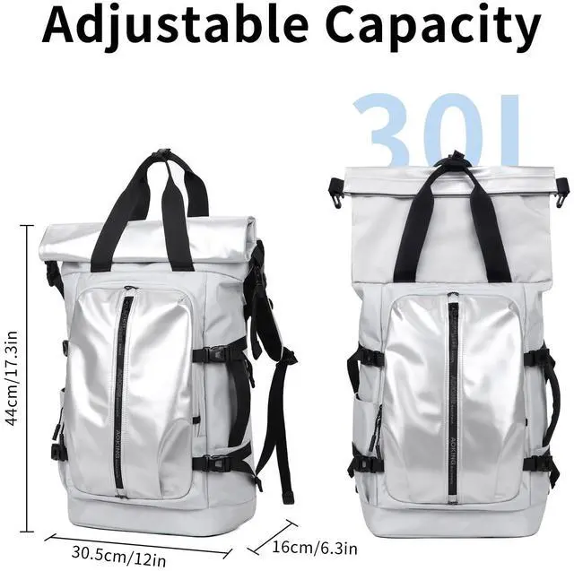 Versatile Rolltop Backpack: Meet this backpack for men and women. With a 22cm rolltop, it expands from a 25L daypack ( 17.3" x12"x 6.3" ) to a 30L travel backpack. It neatly carries your 15.6" laptop and daily needs, offering a smart, compact look for city and travel use. ^^