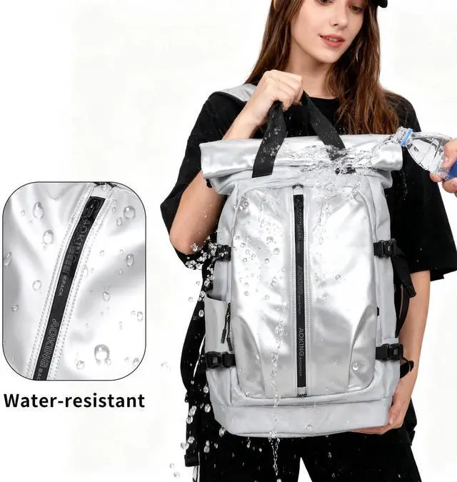 ^^ Durable & Water-Resistant: Built with tough, water-resistant Oxford fabric, this loptop backpack keeps your gear safe and dry. The roll-top design and slash-proof material offer added theft protection, ideal for navigating busy city streets day or night.