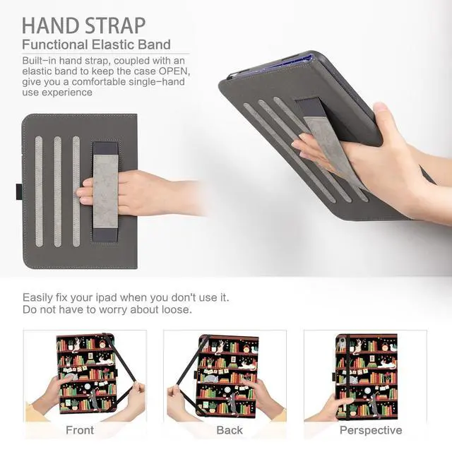 Case 2018(Model: A1980/A2013/A1934/A1979)Premium MaterialCase for Air 11 inch m2 is Made of reinforced external PU leather dual layer construction and soft internal microfiber lining to give you 360 full protectionSmart Auto Sleep/ WakeCase for iPad Air 5th Gen/Air 4th Gen Case 10.9 Inch instantly wakes up tablet when opened, and makes it go to sleep once closed (extend battery life). Upgraded Anti-slip StripesWith three anti-slip stripes, you can adjust it to multiple stable angles, holding up great for viewing, video watching and reading at home, or presenting at your meeting. Hand StrapBuilt-in hand strap, coupled with an elastic band to keep the case OPEN, give you a comfortable single-hand use experienceExternal Elastic BandWhen you don't use it, strap help you more firmer to fix your tablet. Do not have to worry about loss and loose. Front Document PocketDocument Pocket is designed for you to store your business cards, Cash, bank cards, notes or bills while on the go. Pencil HolderStylus Loop is more convenient save your Pencil.