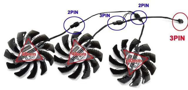 3pcs 75mm Fan (2pin + 3pin + 2pin) and power connector is 3pin