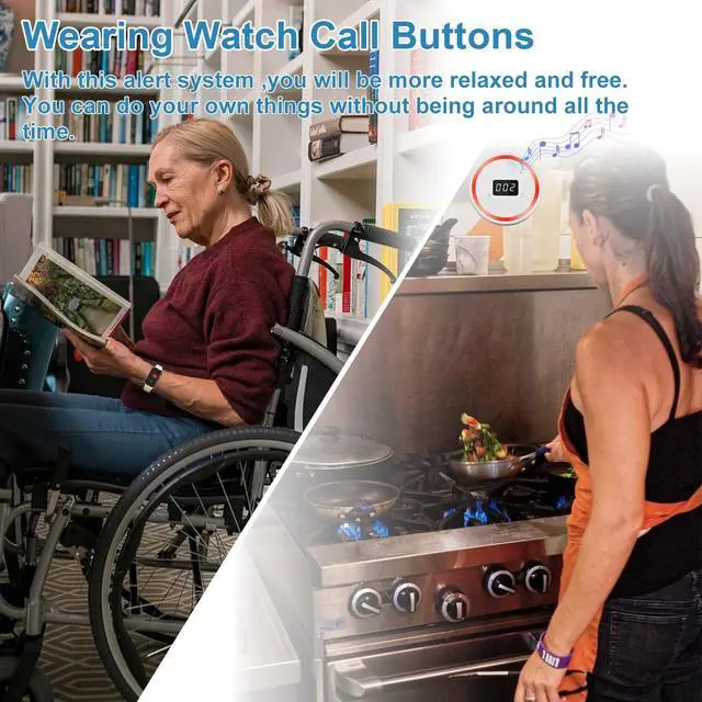 And the signal range of the alert system is about 328 feet (The actual distance depends on the application scenario) ^^ The call button can be stuck on the wall or hung around the neck. The watch call button can be directly worn on the wrist and can meet all your wearing needs. When seeking help is needed, just press the button and the receiver will play a beautiful melody set in advance ^^ Wireless Caregiver Pager is widely applied in home, hospital wards, nursing homes, churches, hotels, and rehabilitation centers.