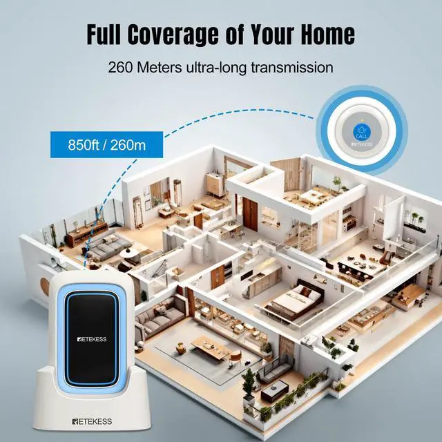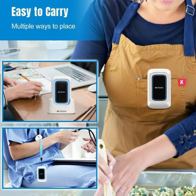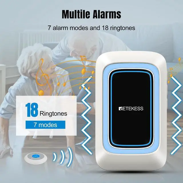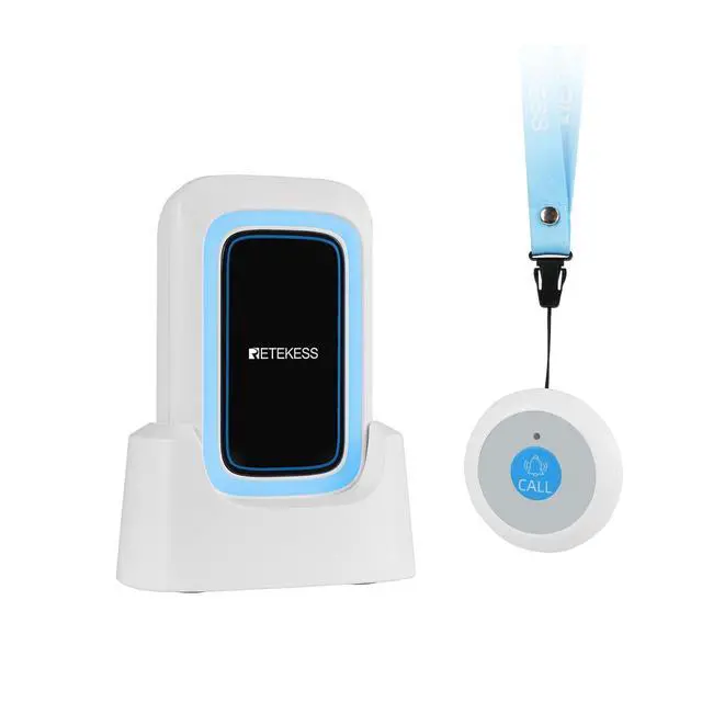 Long-distance transmission capability; with a communication distance spanning 850 ft/260m; Retekess TH109 call bell system guarantees seamless connectivity of the call signal; empowering swift action in times of need ^^ Multiple alarm types; stay prepared for any eventuality with the caregiver pager; equipped with sound; light; vibration and etc; empowers to choose the most effective combination for any scenario ^^ Dual charging modes; the caregiver pager system boasts two charging methods: a charging base; and a type-c port for charging; ensures adapting to any scenario; enhancing response readiness and user convenience ^^ Low power alert; stay connected; the caregiver pager alerts instantly when battery drops below 20%; ensuring timely recharging for uninterrupted safety; immediate notification to prevent communication interruption ^^ Portable and easy to use; designed for instant use; the medical alert systems for seniors comes bundled with a base stand; back clip; hanging strap; ensuring you're always ready to call for help; wherever you are