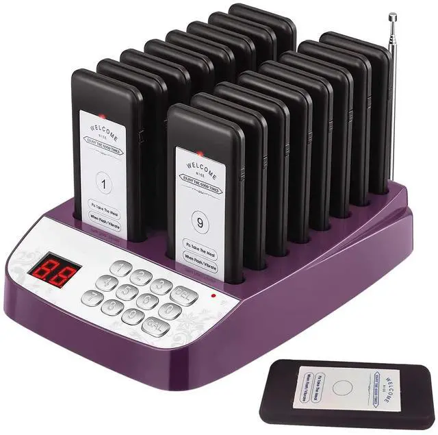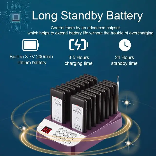 Outstanding Performance: Restaurant pagers system has 16 battery charging slots that can charge 16 receivers (IP55 waterproof) at the same time. Each receiver has a built-in 200mAh rechargeable lithium battery, Approximate standby time of up to a full day. Please feel free to use it, we provide customers with 12-month repair services ^^