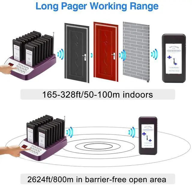 Range Pager System: Indoor distance up to 165-328ft/50-100m, The longest distance in the barrier-free environment is 2624ft/800m in open area, it can effectively reduce the crowd gathering and provide better safety protection measures for your staffs and customers ^^