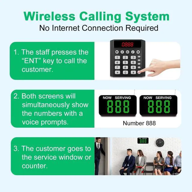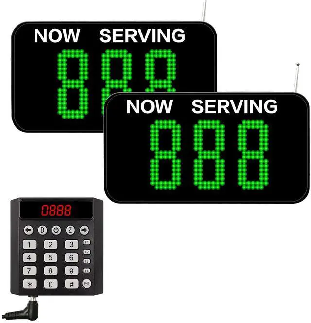 How It Works Press the corresponding number key to call the customer when it's their turn. The screen will show and broadcast the number, the customer will then go to the service window. A single keypad can simultaneously call multiple displays, while multiple keypads can also call a single display.