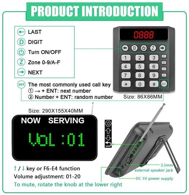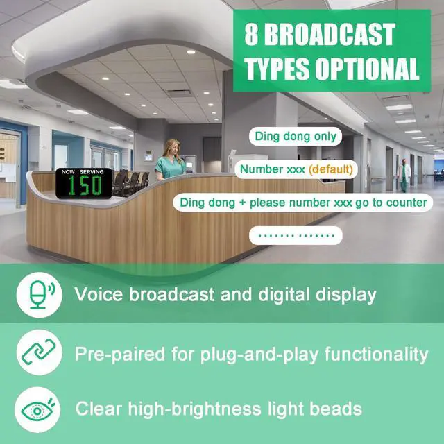 Multi-Function Number Display The dot-matrix led display can be mounted on a wall or desktop. Its voice mode, volume and number of prompts can be adjusted. The default voice is "Number XXX", you can choose a voice reminder with only a ding-dong sound (no number is broadcast)