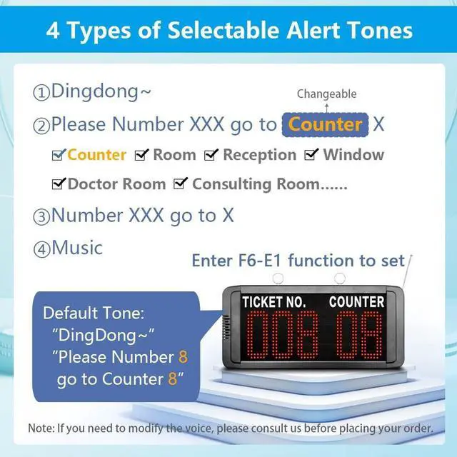 Freely Set Start and End NumbersThis queue system can store up to 999 numbers, and by default, the numbers are displayed sequentially from 001 to 999. You can limit the call range on the display, for example, setting it to 50-100. This feature enhances the flexibility of the wireless queuing system.