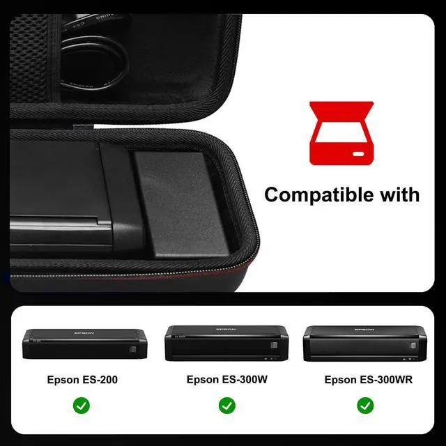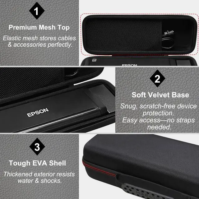 ^^ CONVENIENT DESIGN: This design features an inner mesh pocket for accessories and a dedicated space for the power adapter. The interior is custom-shaped to securely hold the Epson Document Scanner, eliminating the need for elastic bands or partitions. This reduces weight and allows for quicker, more efficient access and storage. A smooth 360-degree zipper ensures effortless operation.