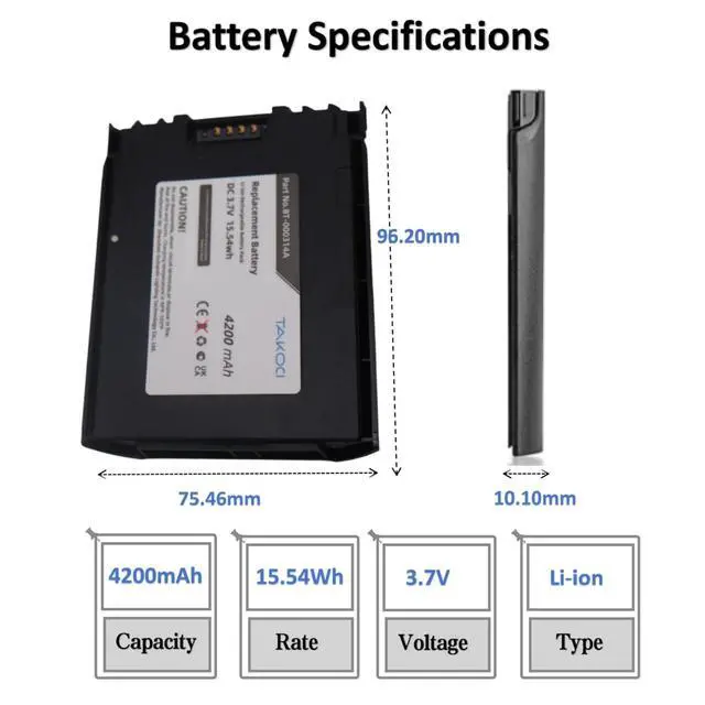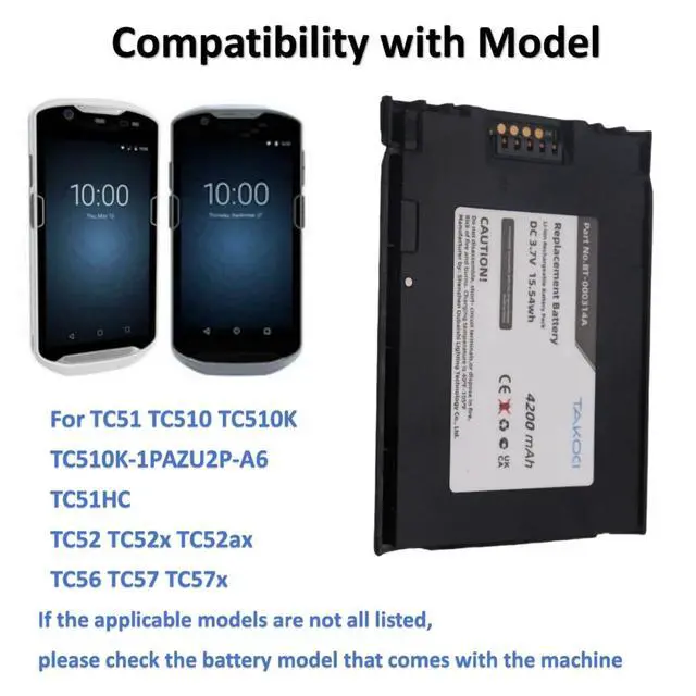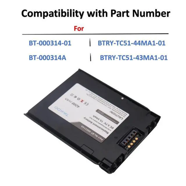 BT-000314-01BTRY-TC51-43MA1-01BTRY-TC51-44MA1-01Specifications: Voltage 3.7VR ate 15.54W hTypeLi-ionCapacity4200mAhNet Weight 98.0 g / 3.46 ozSize 96.20 x 75.46 x 10.10 mmTips Before PurchasePlease check the compatible model and the original battery number before purchasing.