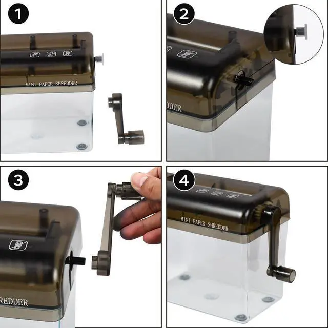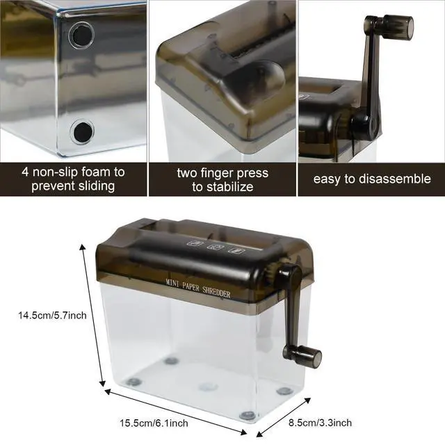 Note: CAN NOT shredder plastic, card or thick or soft paper (such as toilet paper, napkins, kitchen paper. ) ^^ Easy to useNo power needed to run with little noise, simply crank it with your hand to shred any paper in seconds, its safer for kids and their fingers than normal electric shredders, anyone can use easily. ^^ Convenient DesignPortable handle with 1L transparent plastic window bin makes it easy to see when it is full, you just need to gently remove the lid to empty. And the bottom is equipped with 4 non-slip foam to prevent sliding. ^^ Shredding SpecificationsBecause of its mini size, you may need to fold paper in half to fit into the opening, but it will still be able to shred it in no time. Its limit is 2 sheets A4 paper folded in half.