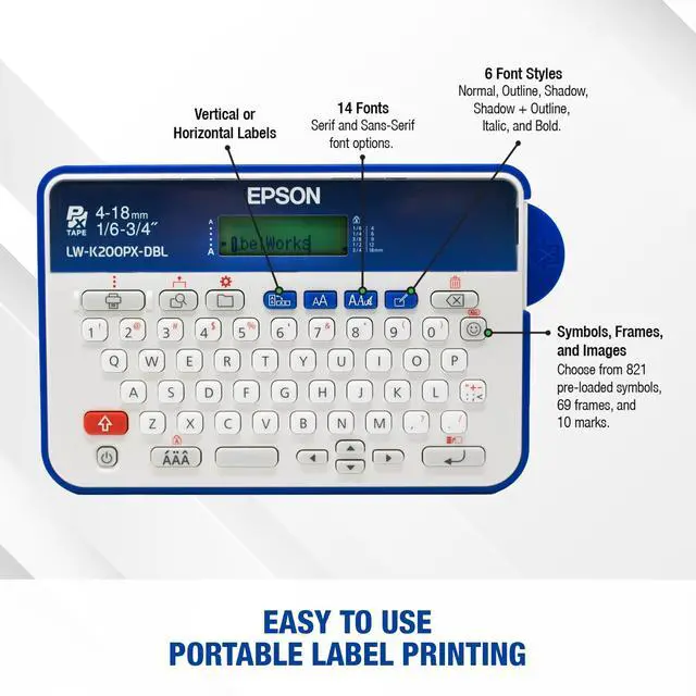 PORTABLE EFFICIENCY - Whether you're a small business owner, hobbyist, or working from home, the compact and portable Epson LABELWORKS PX label maker is designed for all your labeling needs. With a full QWERTY keyboard, it's perfect for organizing, crafting, and personalizing everything from office supplies to pantry items. The LW-K200PX-DBL model is ideal for those who need efficient labeling on the go. ^^ VERSATILE TAPES - Create custom labels for any purposecrafting, organizing, identifying, and more. This label maker supports labels up to 18mm (3/4") and is compatible with over 100 Epson LABELWORKS PX tape types, including matte, metallic, gold imprint, pearl, ribbon, fluorescent, and more.