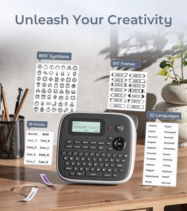 & -: Customize effortlessly with 800+ icons, 100+ borders, and 16 fonts. One-touch editing/printing unleashes creativity for personalized labels. D210s Labeler is ideal for organizing, crafts, or branding ^^