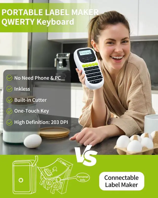 NO APP Needs & QWERTY Keyboard: Just pick up H1100 label maker machine with tape and use it, lightweight (less than 1LB) and fits well in hand, easy to carry anywhere. Label maker with keyboard design make typing for organization is simple and easy. No need to connect any APP, no worry about your personal info will run from your phone