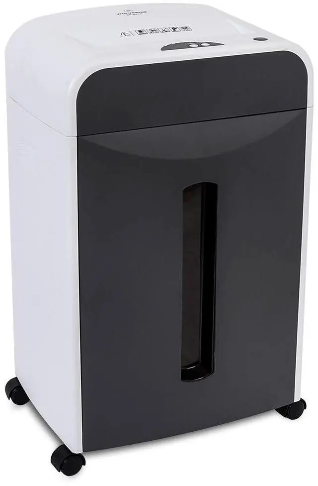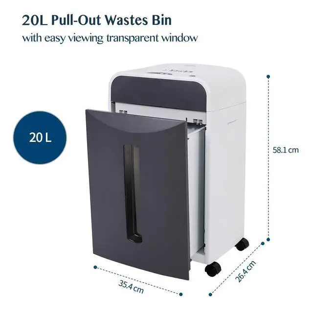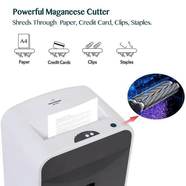 SUPER MICRO-CUT SECURITY LEVEL P-5 paper shredder to secure confidential information. Shreds max 6-sheet paper/staples/clips/credit cards into tiny particles measuring 3/32" x 1/4" (2mm x 6mm) ^^ POWERFUL MANGANESE CUTTER shreds through staples, paper, clips and credit cards and junk mails at ease and lubricant is not needed. ^^ INDUCTION MOTOR shredder has dual thermal protector to keep sustainable using and prolong shredder's lifetime. Grounding plug can protect people from electric shock ^^ LOW NOISE LEVEL of 54dB ultra-quiet performance paper shredder for home office has 5 gallons pull-out waste bin with easy viewing transparent window ^^ JAM REVERSE SYSTEM can automatically detect and clear paper jams.