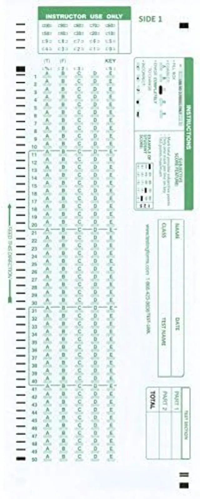 Dimensions: 4.25" x11" Visual Alignment notch allows for easy alignment of many papers at once. There are 100 multiple choice A-E or T/F questions on each side. 1-50 on the front, 51-100 on the back. These are 100% compatible. Forms have darkened bubbles to prevent cheating from other students. Can also serve as a master key with answers when the option above the first item is marked along with option 5 on side two. After entire test set it run through the 888 or 888P scanners, a Item Analysis 9700 form can be used.