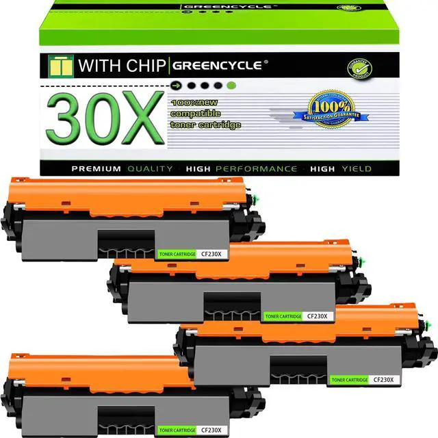 GREENCYCLE 4-Pack High Yield Compatible Toner Cartridge Replacement for HP 30X CF230X 30A CF230A Toner. ^^ The CF230X toner cartridge offers a higher page yield than the CF230A 30A, meeting high-volume printing demands with reduced replacement frequency for assured, extended-life performance.
