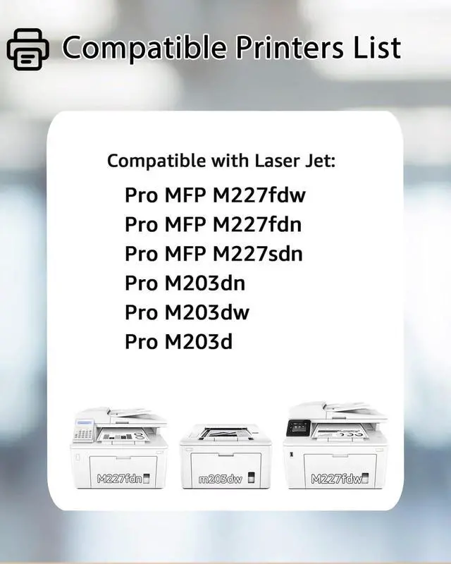 HP Printer: LaserJet Pro MFP M227fdw M227fdn M227sdn M203dn M203dw M203d Printer. ^^ Stability and ReliabilityThe chip has powerful computing and processing capabilities to perform efficiently. It is stable, reliable and functionally depleted to ensure normal operation in a variety of environmental conditions. ^^ Compatible toner cartridges provide same performance and printing as genuine cartridge. Our cartridges are made of quality materials: smart chip, toner powder, smooth OPC & roller and industrial grade packaging. ^^ Make your presentations and printouts stand out with GREENCYCLE toner cartridge that produces clear, crisp, bold, and eye-catching text and graphics that keep people awake at your next meeting.