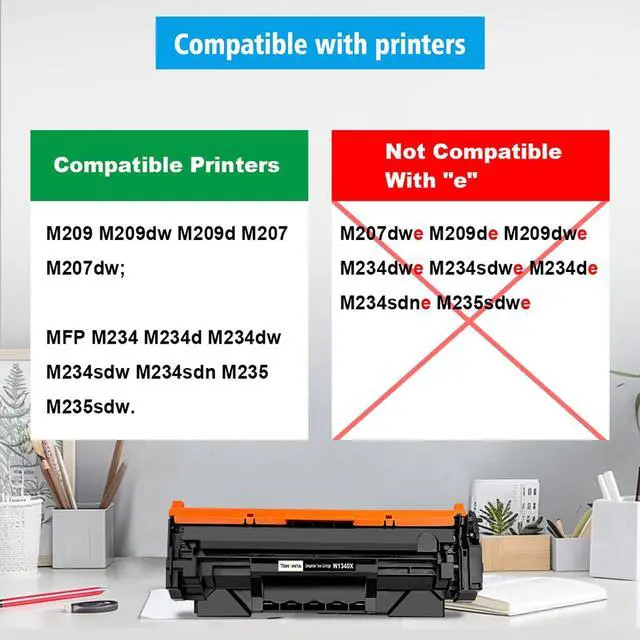 Important Notice: Our W1340A/W1340X compatible toner cartridges are not compatible with H P+ printers that have model numbers ending with "e". H P+ printer only works with original toner cartridge, can not work with compatible toner cartridge. ^^ 2.