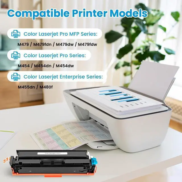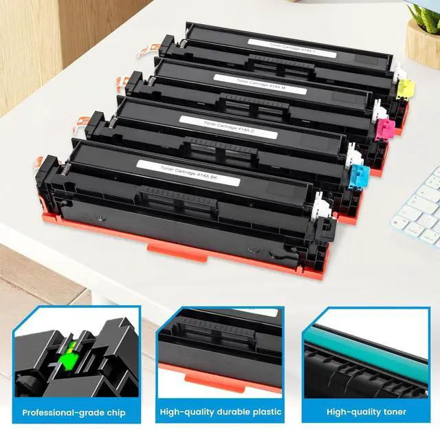 Plug & Play with Upgraded Smart ChipForget complicated chip transfers! Our 414A toner cartridges come with pre-installed, upgraded smart chips for seamless plug-and-play installation. Enjoy guaranteed compatibility and stable communication with your printer, just like the original. ^^ Guaranteed Printer CompatibilityEngineered for flawless performance with Color LaserJet Pro MFP series, including popular models like the M479fdw, M479fdn, M454dw, and M454dn. Also compatible with Enterprise M455dn and MFP M480f models. Rest assured of perfect integration with your office equipment. ^^ High Page Yield for Cost EfficiencyMaximize your printing budget! Each black cartridge delivers up to 2, 400 pages, and each color cartridge (Cyan, Yellow, Magenta) yields up to 2, 100 pages (at 5% coverage).