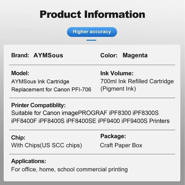 Package Contents: 1 Pack Magenta 700ML PFI-706 Pigment ink cartridge with SCC chip ^^