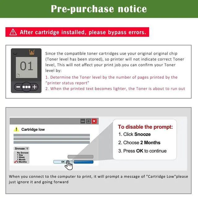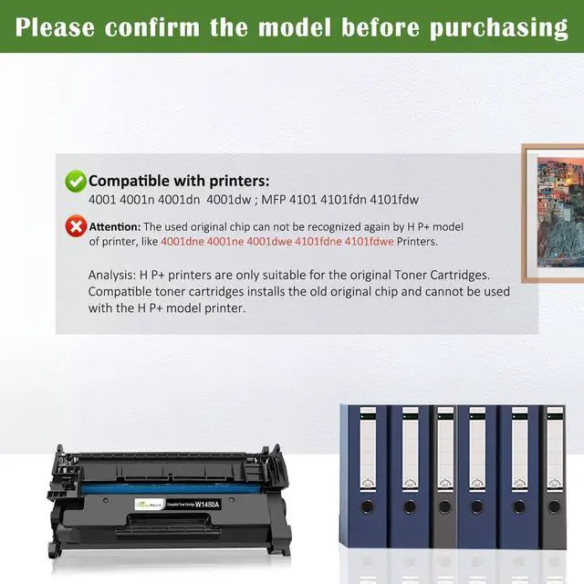 WARNING Compatibility Alert: Our compatible toner cartridge cannot be used with H P+ printers whose model names end in "e. " These printers are engineered to operate solely with genuine HP cartridges. Our compatible toner cartridge only works with non-H P+ printer, there is no "e" on printer model. ^^