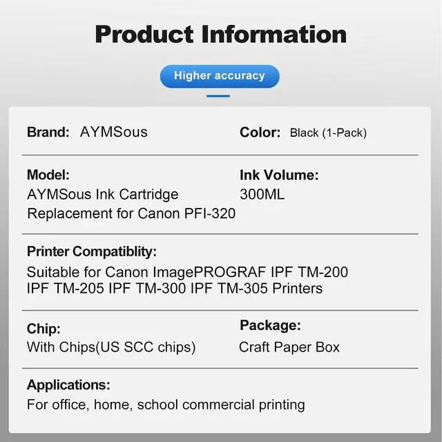 AYMSous Compatible Ink Cartridge Replacement for Canon PFI-320 PFI320 PFI-320BK PFI320BK 300ML for Canon imagePROGRAF IPF TM-200 IPF TM-205 IPF TM-300 IPF TM-305(Black, 1-Pack)