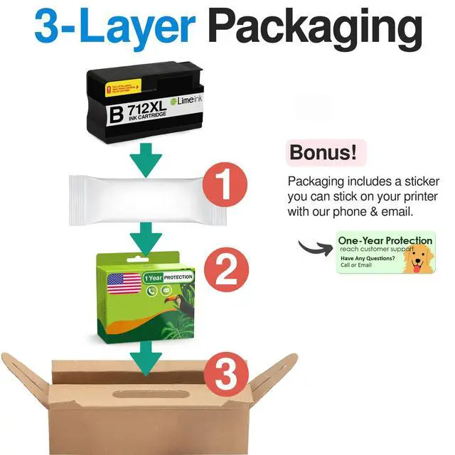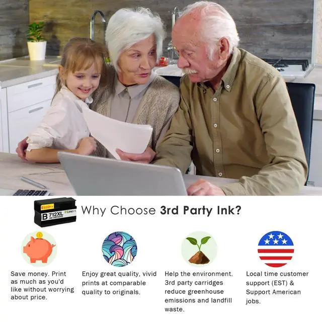 GET RELIABLE, QUALITY PRINTS AS GOOD AS ORIGINAL INK. Get your ink from a US-based, accountable company that can be reached easily. Our remanufactured ink cartridges are tested to ensure consistent, quality prints that match the image/text seen on one's printer both at the component level and with print tests. All cartridges are tested both at manufacturing, and again at our FL warehouse. This is done to ensure our ink perfectly matches your printing needs- with vivid colors and sharp text. ^^ 1-YEAR WARRANTY AND U. S. -BASED PHONE AND EMAIL SUPPORT.