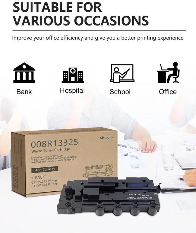 The product includes - 1 Pack 008R13325 Waste Toner Cartridge ^^ Pages Yield - C310/C315 Waste Toner Cartridge up to 30000 pages, with a coverage rate of 5% (Letter/A4) ^^ Applicable printer - C310 C315 C310DNI C310DNIM C315DNI VersaLink C415 C410 Printers ^^ Strong compatibility - The 008R13325 waste toner cartridge has high compatibility and can be used for various brands and models of printers, perfectly matching the printer structure and making it easier to identify ^^ Tips - Though the toner cartridge and waste toner box are two separate components, they must be used together as a matched set.