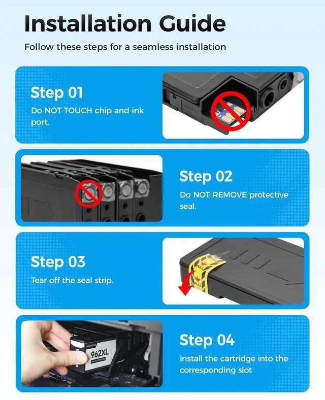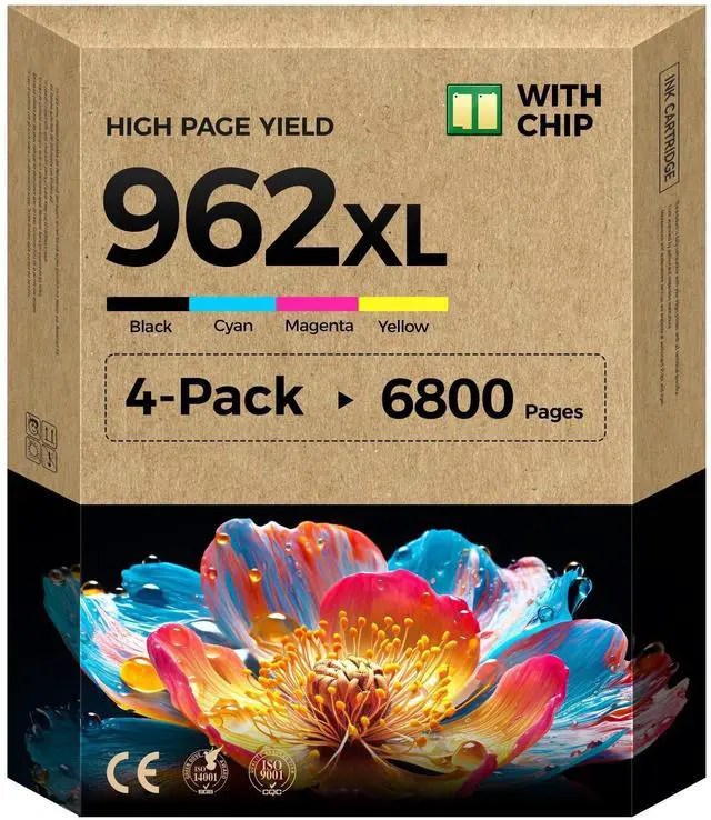 Package Contents & Value: Includes four individual 962XL ink cartridges: 1x 962XL Black, 1x 962XL Magenta, and 1x 962XL Yellow. Each 962XL ink cartridge is tested for quality and reliability, providing a cost-effective replacement for HP 962/962XL ink.
