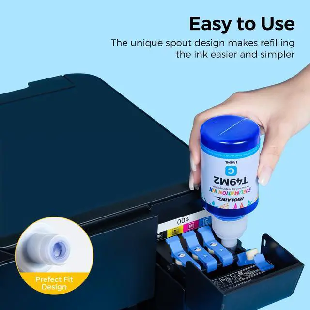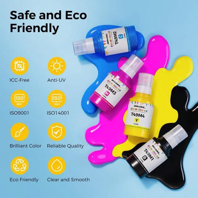 [Specifically Designed] MIOLAINZ T49M sublimation ink compatible for Epson f170 sublimation printer and Epson f570 sublimation printer. ^^ [Syringe-Free Autofill] No need for syringe anymore! The Mouth of the bottle perfectly fits the f170 f570 printer ink inlet, no need to squeeze, and the filling stops automatically. ^^ [ICC-Free] Get the best print quality and performance without any ICC Profile. ^^ [Colorfully Vibrant] MIOLAINZ sublimation inks offer rich, vibrant colors and are durable, retaining their original colors even after repeated cleanings. This ensures the print head is less likely to clog and offers enhanced color reproduction, resulting in vibrant, rich images.