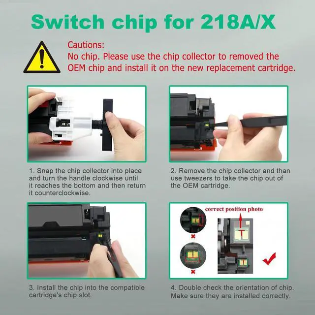 ^^ No Chip: These 218A/218X toner cartridges do not have chips, need to transfer orginal 218A/218X toner chip to them. Specific removal and installation steps are detailed in the instructions. (Tools are equipped) ^^
