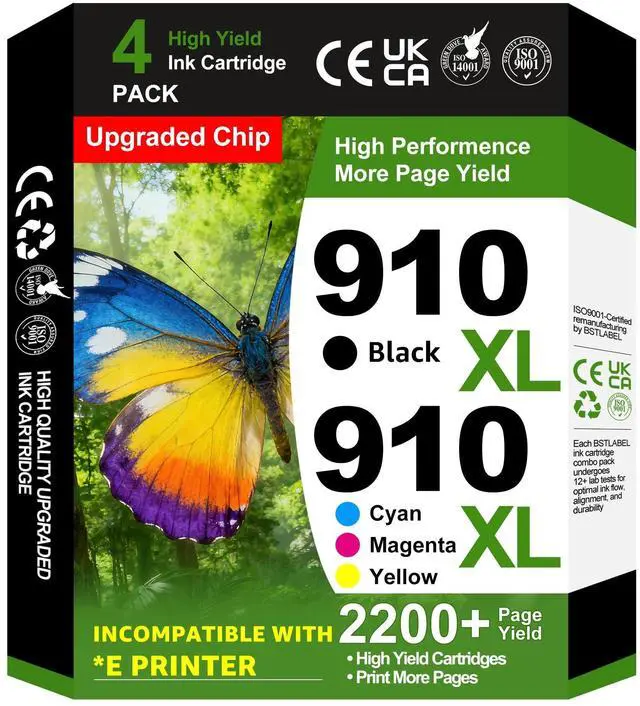 ^^ Package Contents: 1 x 910XL High-Yield Black Ink Cartridge, 1 x 910XL High-Yield Cyan Ink Cartridge, 1 x 910XL High-Yield Magenta Ink Cartridge, 1 x 910XL High-Yield Yellow Ink Cartridge 4-pack in total, perfect for high-volume printing needs. ^^ Exceptional Page Yield for