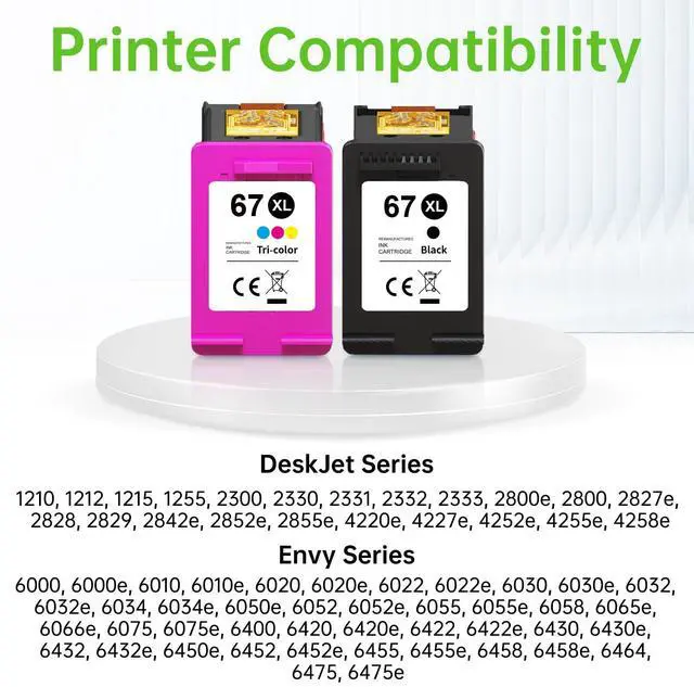 Remanufactured Ink Cartridge: Each ink 67xl printer cartridge is equipped with the latest chip, and is strictly tested in production to ensure that each ink 67 cartridge can be recognized and used by the printer. ^^ For Hp Ink 67 works with: DeskJet 2855e 1210 1212 1215 1255 2300 2330 2332 2700 2710 2710e 2720 2720e 2721 2721e 2722 2722e 2723 2723e 2724 2732 2742e 2752 2752e 2755e 2820 2821 2821e; Deskjet Plus 4110 4110e 4120 4120e 4121 4122 4122e 4130 4140 4152 4155 4155e 4158 4158e 4200 4220 4220e 4255e printer ^^ For HP 67XL
