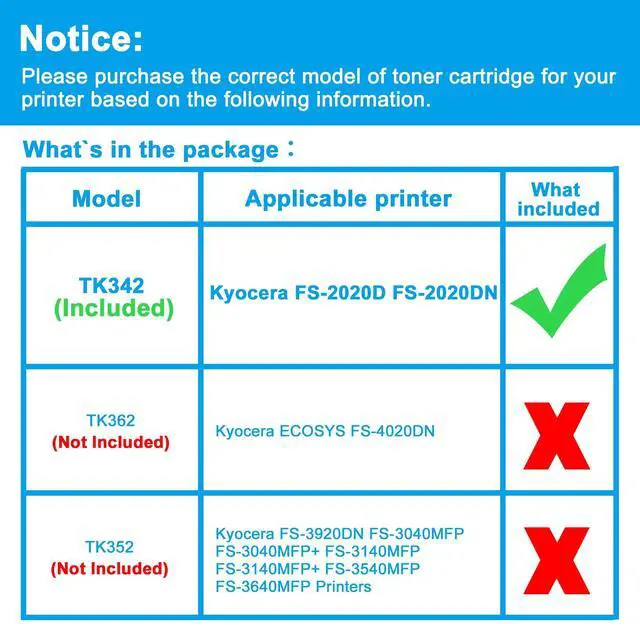 Reliable Quality: LCL TK342 cartridge uses high quality toner, toner particle size distribution, good mobility, high transfer rate, resulting in a clear image and high gloss print effect; Printing efficiency is high, waste powder rate is low, so as to ensure sufficient page yield.