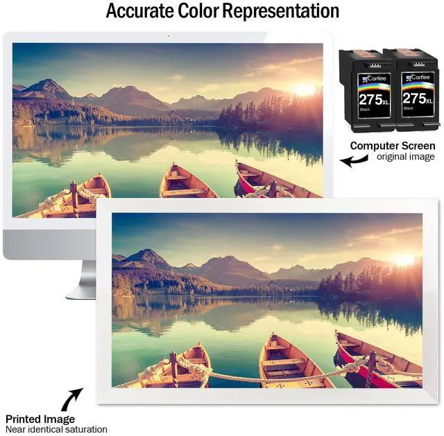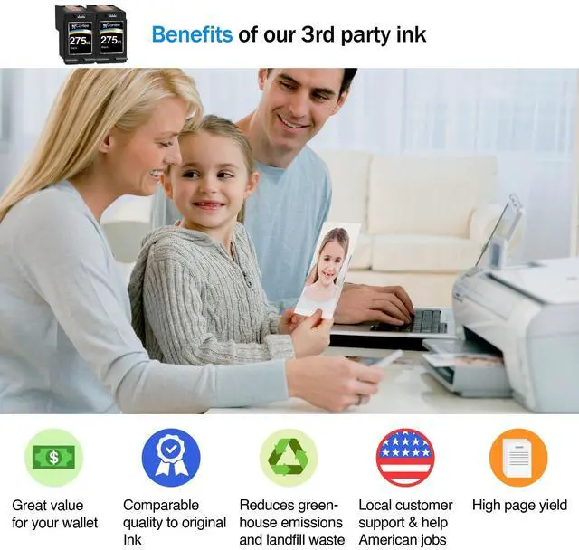 Compatible with Canon printers: PIXMA Series TS3500, TS3520, TS3522, TR4700, TR4720, TR4722. CONTENTS. 2 remanufactured for Canon 275XL black ink cartridges. HIGH PAGE YIELD. up to 450 pages per black cartridge. MORE INFO. All ink cartridges come filled with a new generation chip, work with all new printers, and display ink levels. They are ISO9001 certified for cartridge quality and reliability, and ISO 14001 certified for environmental impact.