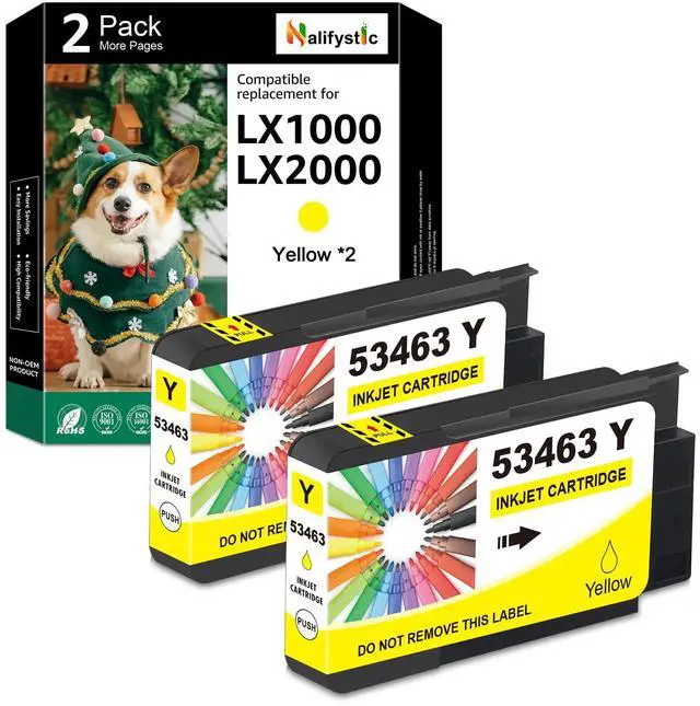 Compatible 53463 Ink Cartridge Includes2x 53463 yellow Ink cartridge. ^^ Compatible for Printer ModelCompatible 53463 Ink Cartridges Replacement for Primera 53461 53462 53463 53464 for LX1000 LX2000 Printers. ^^ Compatible 53463 Approx. Page YieldThese compatible 53463 cartridge replacements for 53461 53462 53463 53464 each have up to 8, 000 pages and offer superior print performance and quality. ^^ Superior CompatibilityEach compatible 53463 ink cartridge undergoes quality and functional tests before leaving the factory, ensuring the printing quality of the ink cartridge. Whether you print documents, presentations or charts, you will get reliable printing effect, just as if it won't damage the printer.
