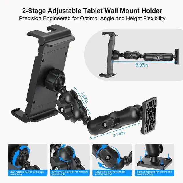 Versatile for Any Setting: Ideal for vehicles, homes, offices, or classrooms, this tablet wall mount delivers unwavering stability. Two precision knobs allow seamless angle adjustments, perfect for navigation, remote work, or studying with this iPad wall mount. ^^ 5.