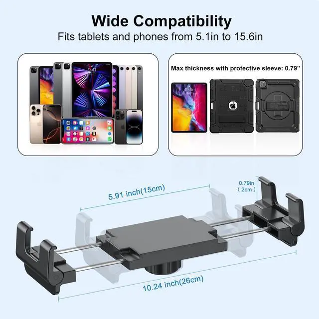 Universal Compatibility: Designed for devices from 5.1" to 15.6", this iPad mount for truck supports iPhone 16/15/14, iPad Pro, iPad Air, iPad Mini, Galaxy Tab S9/S8/S7, Fire HD, Surface Pro/Go, and more. Devices 7.9 inches and phones must be mounted vertically. ^^
