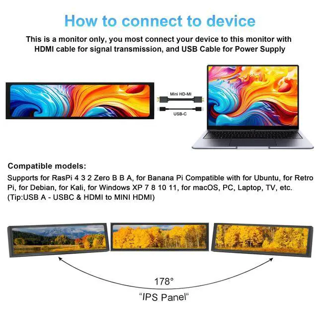 (Kindly Reminded: If you need to use Aida64, please download it yourself) ^^ Plug and Play MonitorEasy to useNo driver needed, easily connect to your laptop or computer with USB-C (only for power input) /Mini HDMI interface (for signal input). This LCD monitor need connects to your device via the HDMI port to play videos and photos. ^^ Portable External Monitor Lightweight construction make it an ideal companion for professionals on the go. Enhance your mobile workstation without sacrificing portability, The portable screen for laptops comes with holes which compatible with standard 75x50mm wall mounts. ^^ High Brightness500 cd/mdisplay brightness screen allows for clear and bright viewing in both dim and bright environments. It will offer you a better and brighter user experience. ^^ After-Sales ServiceWe place great importance on the buyer's experience, should you encounter any issues, please feel free to contact us via message, we will provide service that meets your satisfaction.