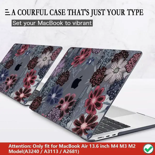 ^^ WARNING: NOT FOR MacBook Air 13-inch 2018-2021 Release M1 A2337/ A2179/ A1932 model and other model laptops. Please kindly check the model number "Axxxx" on the back of the laptop before purchase, make sure you choose the right model "A3113" or "A2681" or "A3240". ^^ Pretty Case, Durable Material Made of plastic materials with 3D UV 4-layer process printing technology, beautiful case of individuality, Well-printed design on a plastic hard case with soft touch texture. Artistic surface of the laptop that also makes your silver /space gray/ starlight/ midnight mac book air 13.6 out of the ordinary while keep the original design. Bottom cover with vent slots to heat dissipation and 4 raised rubberized feet to keep your laptop firmly on the place. ^^ Snap on/Clip On Design, Easy Installation & Removal Top Cover and Bottom Cover Two pieces (separated cover) and Snap on design, easy to clip on and take off, let you open/close your MacBook freely over 90 degrees all the time. Thunderbolt port access, also access to all ports without removing the case. ^^ 5in1 Bundle