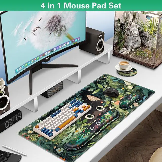 Canjoy 4-in-1 Gaming Mouse Pad Wrist Support Set XXL Large Mousepad( 35.4 x 15.7 in)+ Keyboard Wrist Rest Support+ Coaster Set4-in-1 Mouse Pad SetOur large mouse pad wtih wrist rest support set includes desk pad ( 35.4 x 15.7 inch), keyboard wrist rest( 16.9 x 3.54 inch), mouse wrist rest( 6.3 x 3.1 inch), coaster( 4.75 x 4.75 inch). Exquisite AppearanceCanjoy extended mouse pad and keyboard wrist rest using advanced printing technology, xxl large mouse pad has clear patterns, bright colors. Whether these desk mat with wrist rest set is for study, office, game, decoration orSuperior Control SurfaceGaming mouse pad is made of micro-fiber woven material that allows your mouse to move easily on the mouse pad.