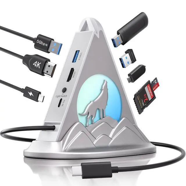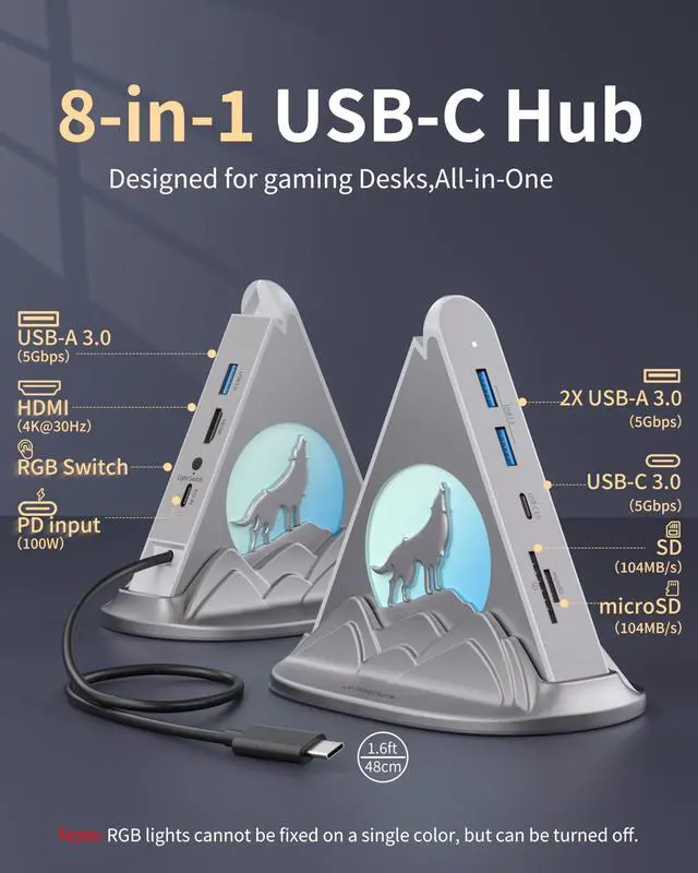 Hub with RGB: Equipped with a 4K@30Hz HDMI port, a high-speed 5Gbps USB-C data port, 3 x 5Gbps USB-A 3.0 ports, a 100W PD port, an SD/MicroSD card reader, and RGB lighting that supports dynamic color modes. This docking station boasts a sleek and ambiance-enhancing design. Its 1.6 ft (48cm) USB-C cable provides ample length for laptop setups, while the vertical design maximizes desk space. ^^