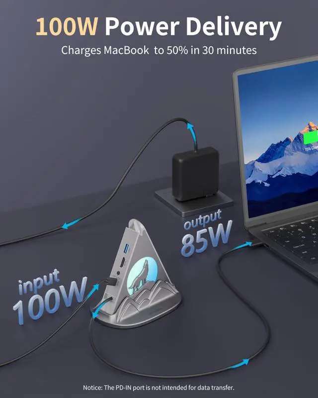 PD Charging: This USB-C hub for laptops supports up to 85W pass-through charging, with 15W reserved for USB peripherals. This enables fast chargingsuch as being able to charge MacBook to 50% in 30 minutesto keep your devices powered and ready during extended work sessions or multitaskingall powered by 100W Power Delivery.
